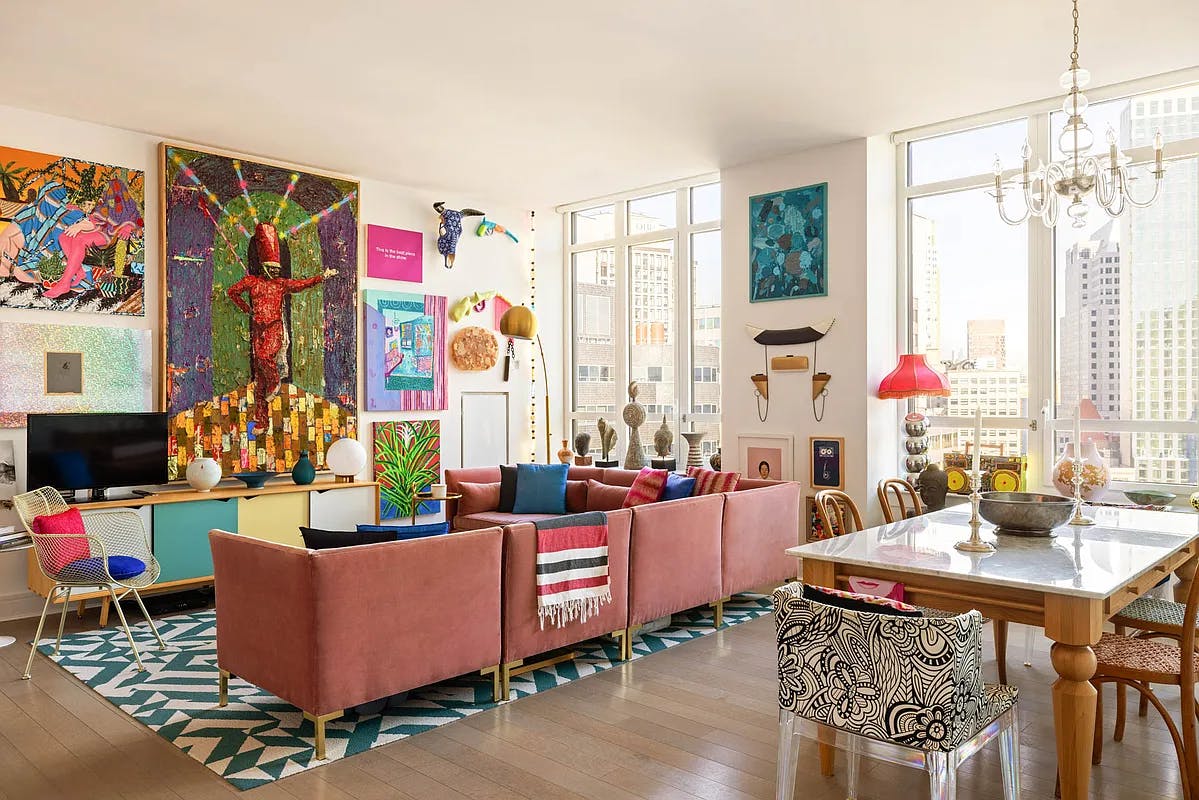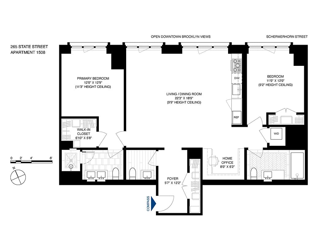 Entirely unique to The Boreum, Apartment 1508 is a gloriously proportioned split two-bedroom, two-and-a-half-bath home where the foyer doesn’t just shove you straight into the living room. Here you can ceremoniously kick off your shoes, stow your coat in a custom closet, surrender your keys on a beautiful console…and pause to admire Katie Bell’s captivating installation…before washing up and sneaking that first peek at your lofty Downtown Brooklyn panorama.