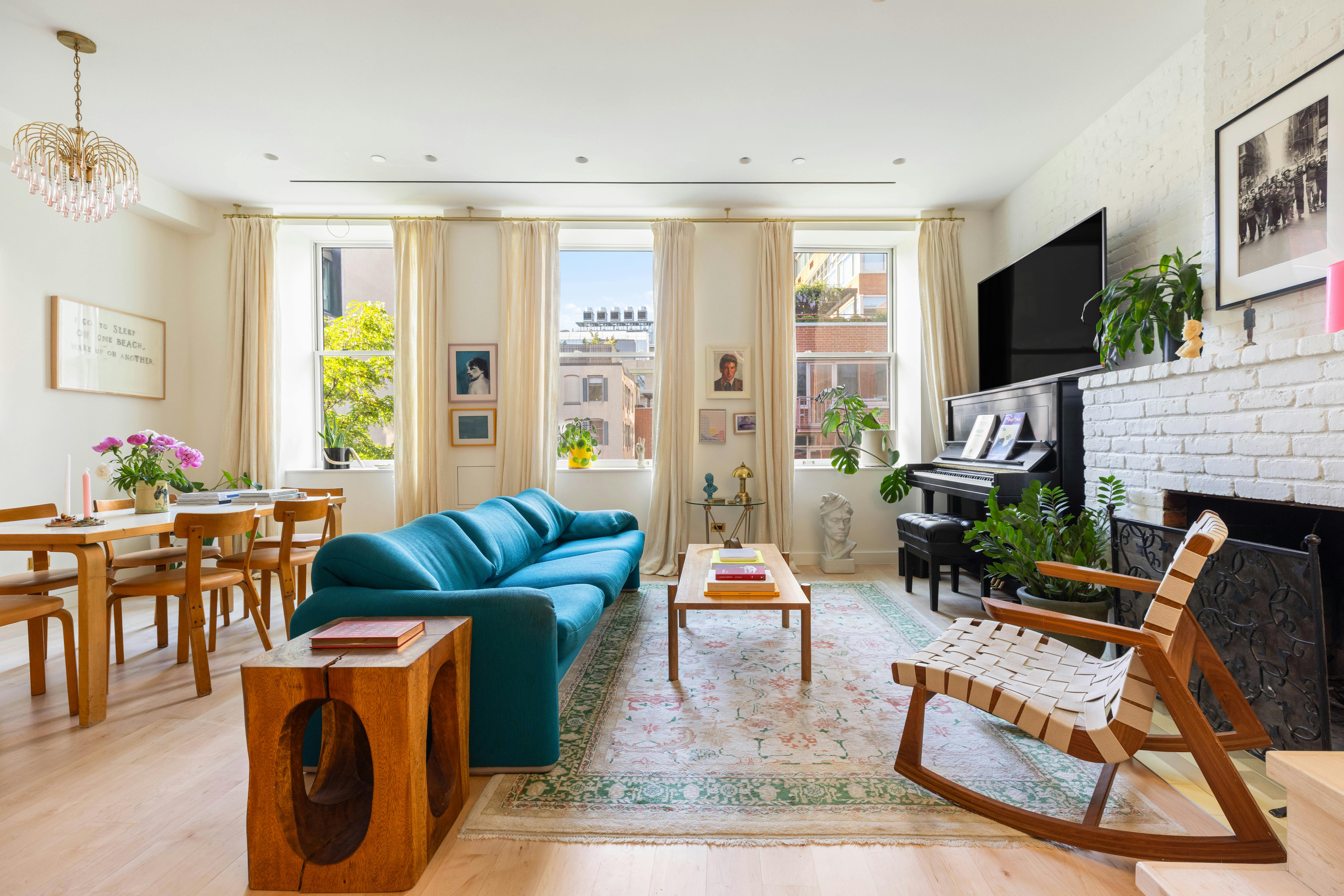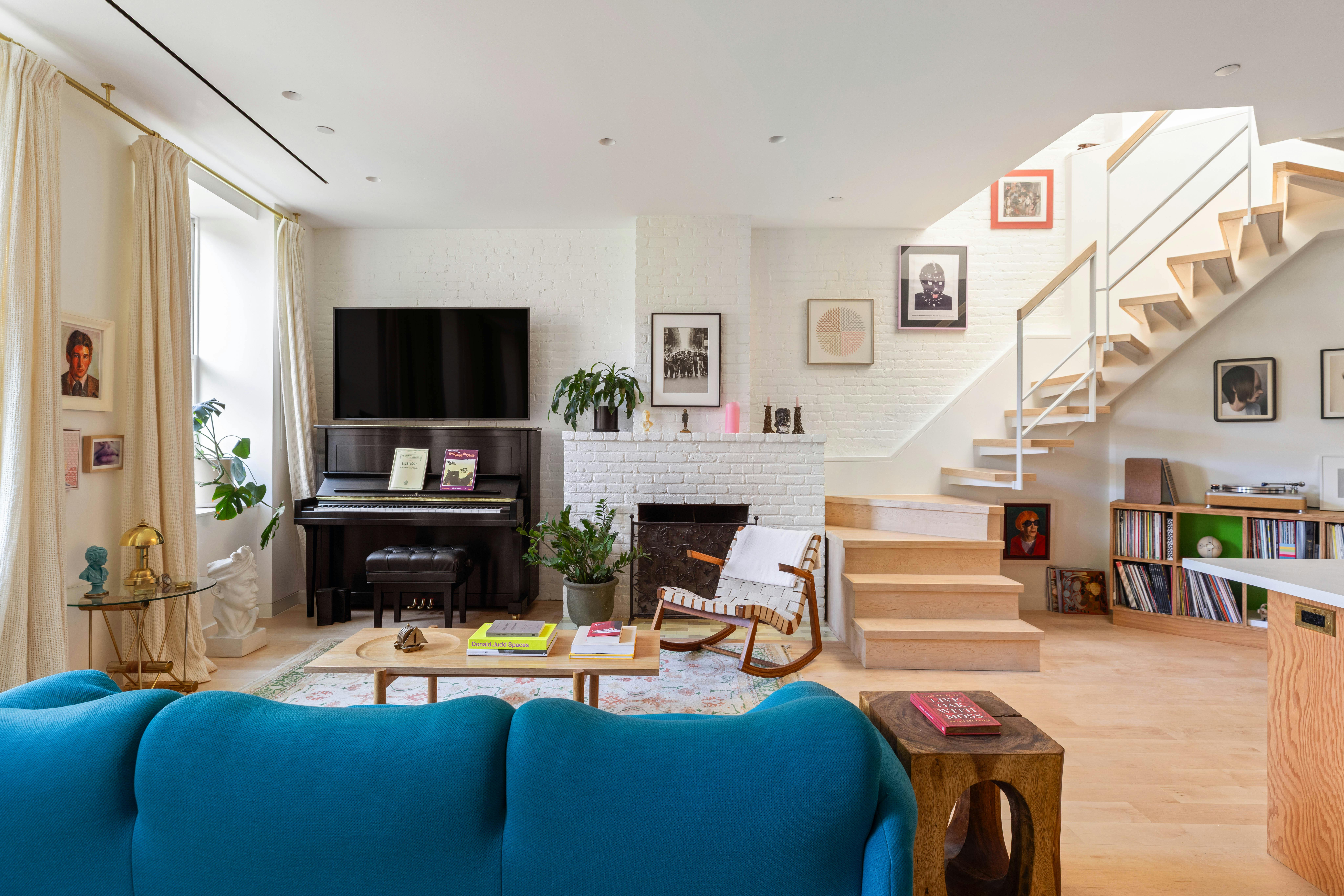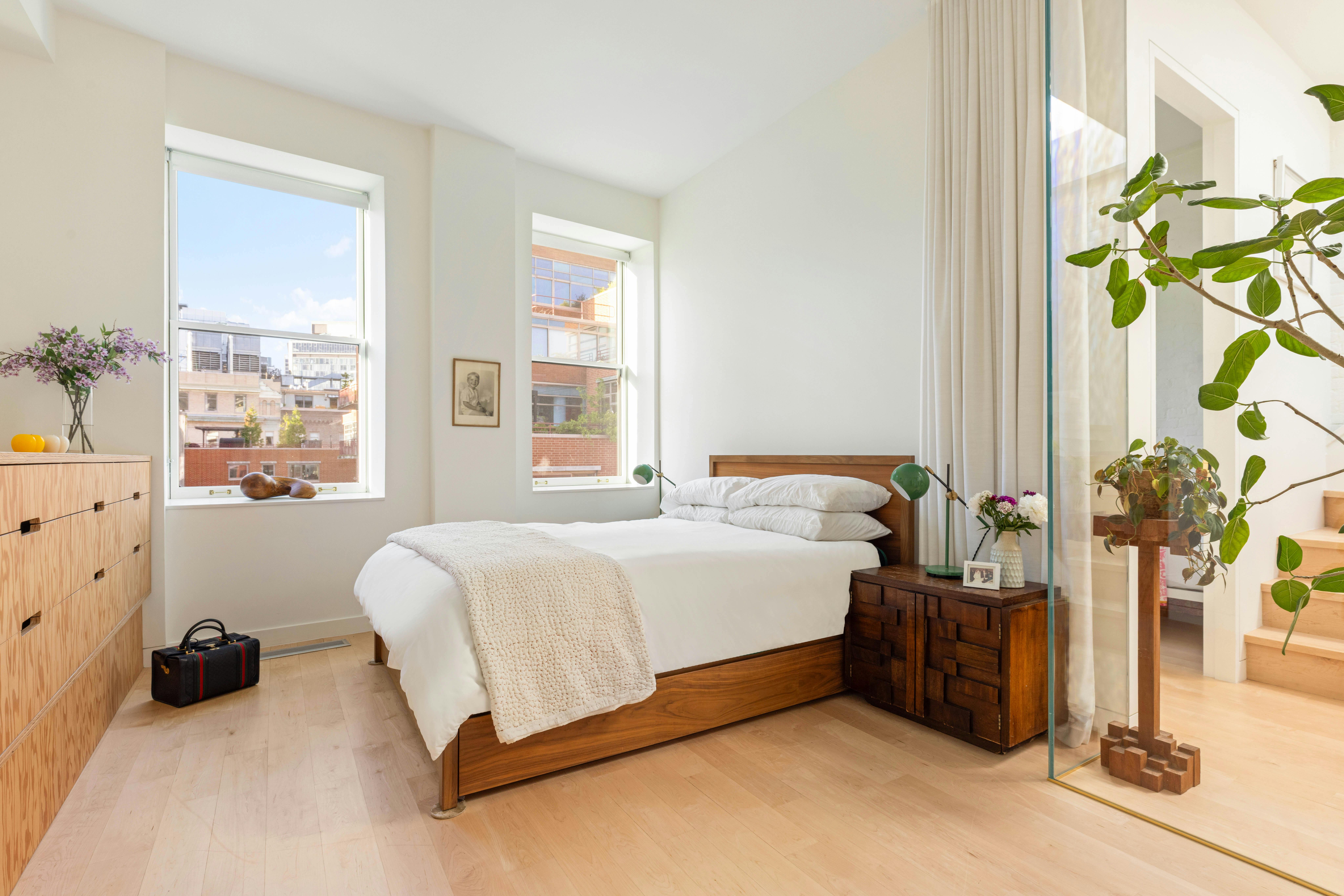 Welcome to the most stylish little duplex in the West Village, complete with your own private rooftop terrace! Lovingly transformed by IDSR Architecture into a delightfully digestible home a few years back, this 2-bedroom, 1.5-bath charmer offers primo living on the West Side. Step into this sun-drenched gem, and you'll be greeted by a staircase so dramatic it deserves its own spotlight. It leads you and your guests up to a lush, irrigated rooftop with Midtown views and a cheeky peek at the Hudson River. But hold your horses! That staircase also lets light flood into the living room, perfect for binge-watching or just chilling. The custom kitchen is a foodie’s paradise, packed with top-notch brands like Kallista, Wolf, and Fisher & Paykel. It's a masterclass in design, with the ideal mix of open shelves, closed cabinets, and stealthy under-counter appliances—a feast for the eyes. While you’re flipping that omelette or mixing a mean cocktail, your pals can either crack up with you on a counter stool, wrap up a meal at the dining table (seats eight comfortably), or get ready for a heated game of Parcheesi by the wood-burning fireplace.