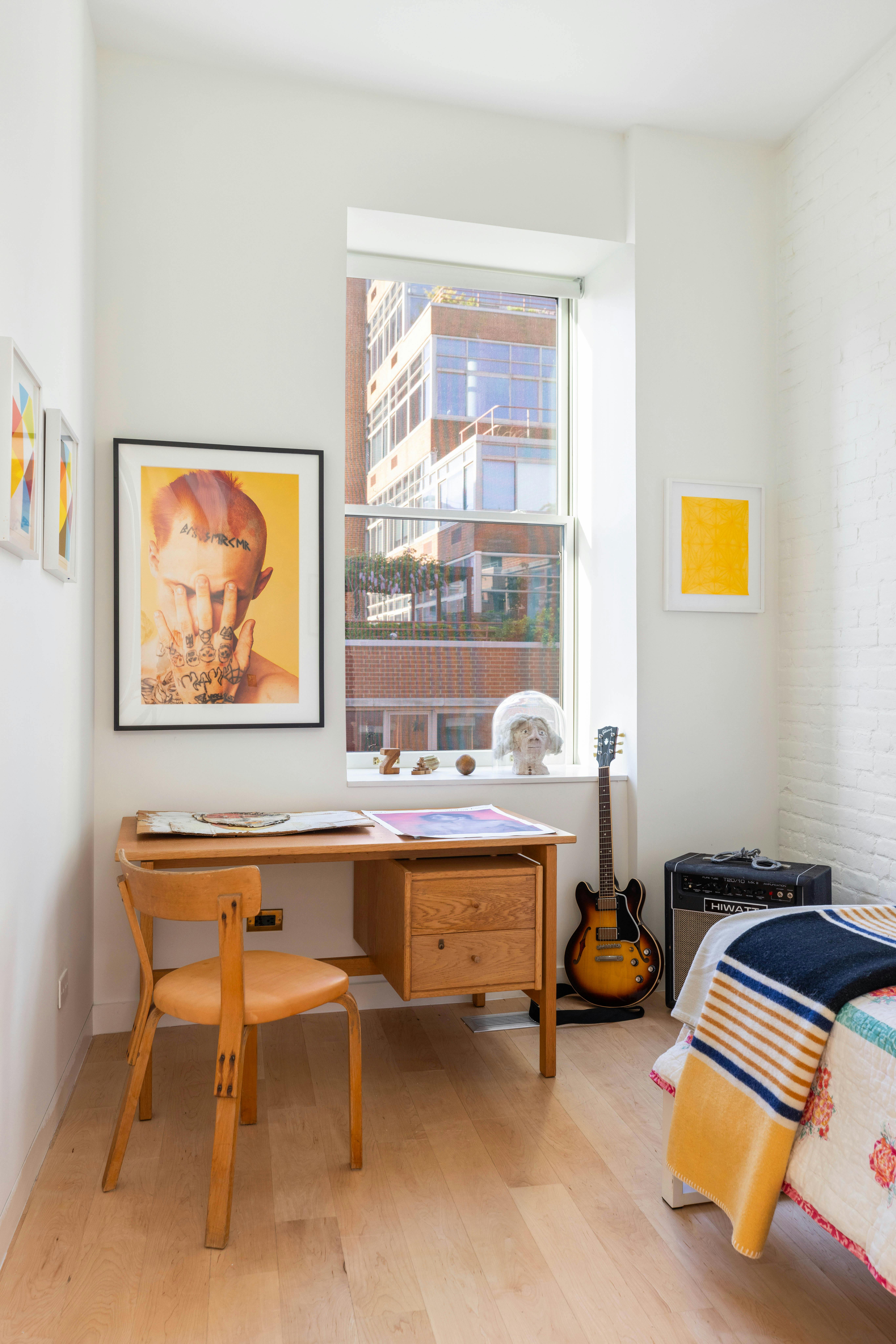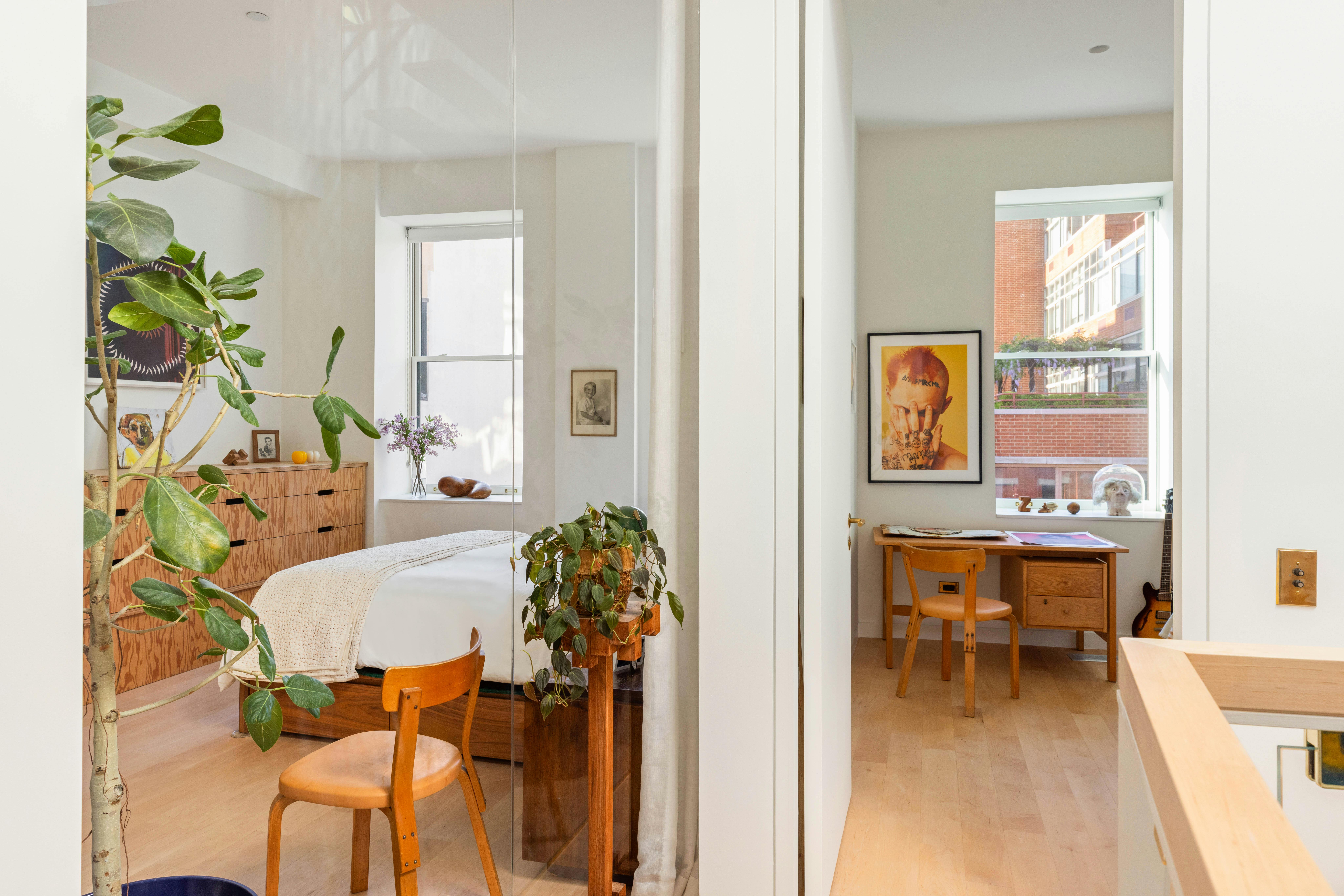 Climbing the first flight of the open staircase, you'll find the central landing rolling out the red carpet to your sleeping quarters. The primary bedroom boasts a glass corner wall, bathing you in light from two sides while you admire the architectural flair of that stunning staircase. Need some privacy? Just pull the curtain and voilà—your cozy retreat awaits. The bathroom here is a spa-like paradise, decked out with white penny tiles, Duravit porcelain, Kallista brass, and a Toto Neorest that looks ready for lift-off. Also on the second floor, there's a charming bedroom or home office gazing north over Jane Street, plus a laundry room that's a Miele marvel, complete with a folding counter and a pass-through hamper from the primary bath. It even has its own entrance, with a direct line to the elevator for those epic summer getaways you’re definitely planning.